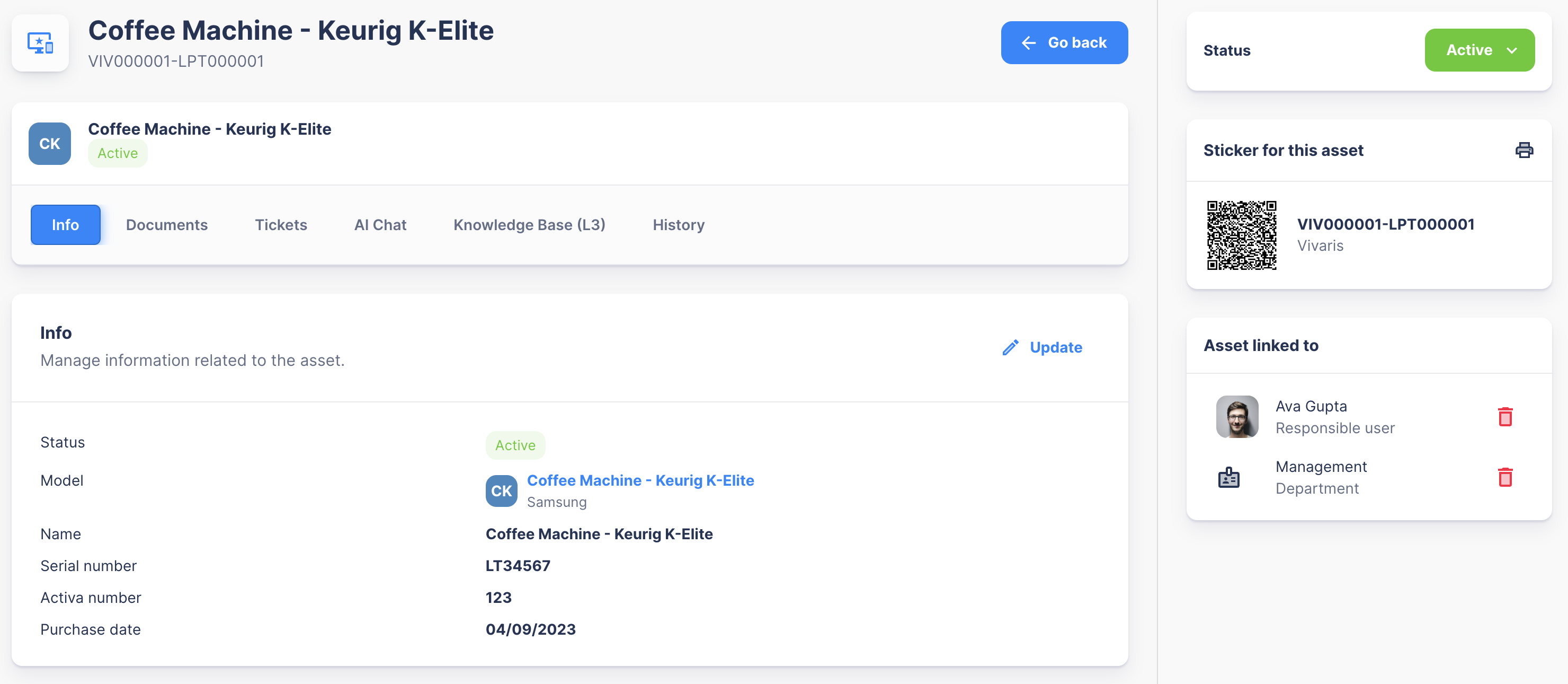 * Each asset has a unique [QR code](https://docs.almitee.io/general-actions/printing-qr-codes) that can be attached to the physical asset. Users can scan this QR code to quickly submit helpdesk tickets or engage with the AI assistant for immediate support.